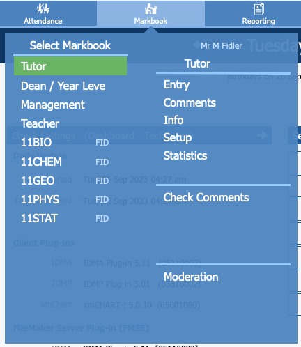 - Select Markbook - this option takes you to a screen where, depending on your permissions, you can select markbooks for other teachers.