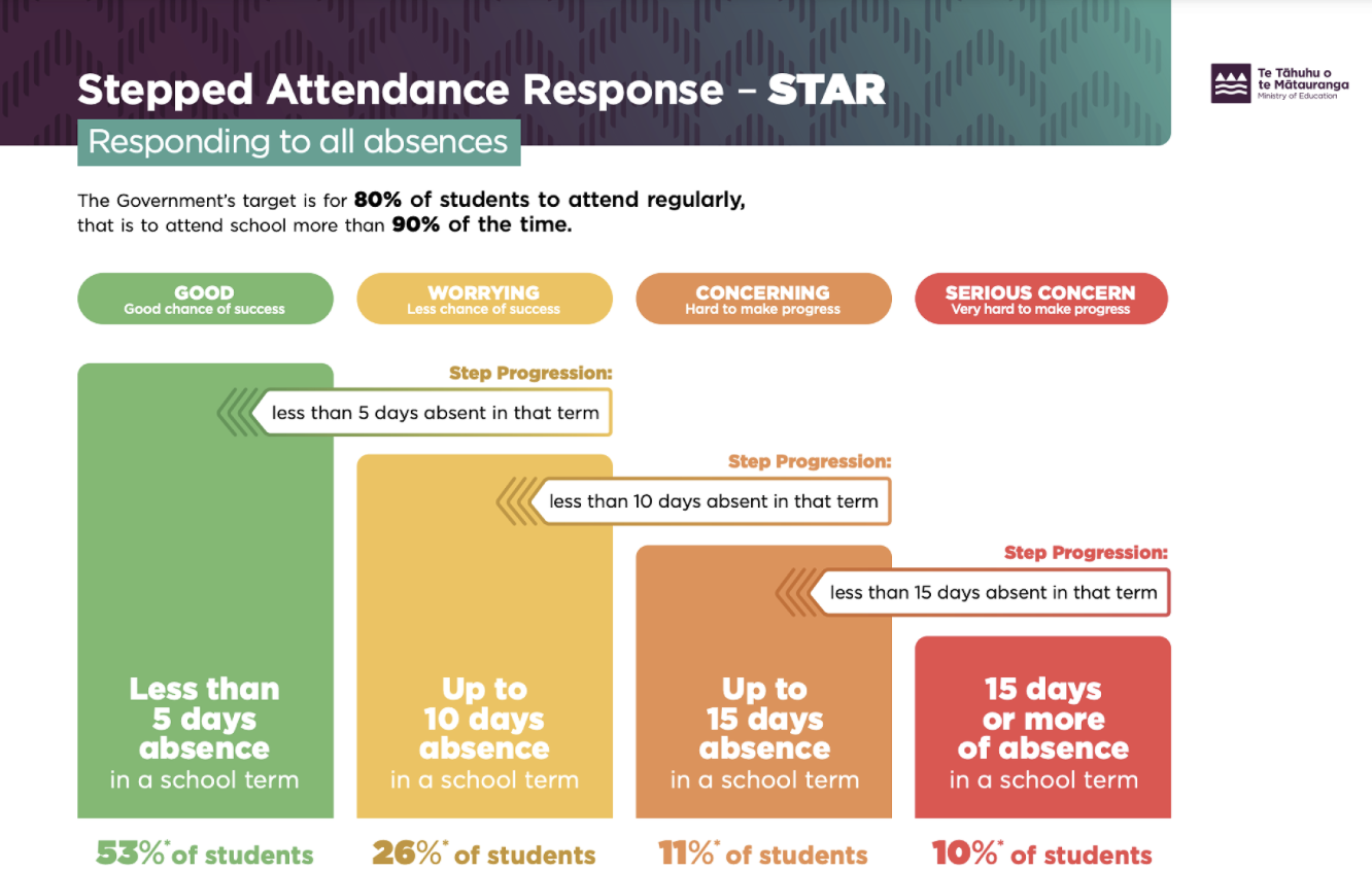 help schools respond to student absences, to maximise educational opportunities by having more students with "regular attendance" at school. Schools are expected to develop an Attendance Management Plan using the STAR framework, so certain