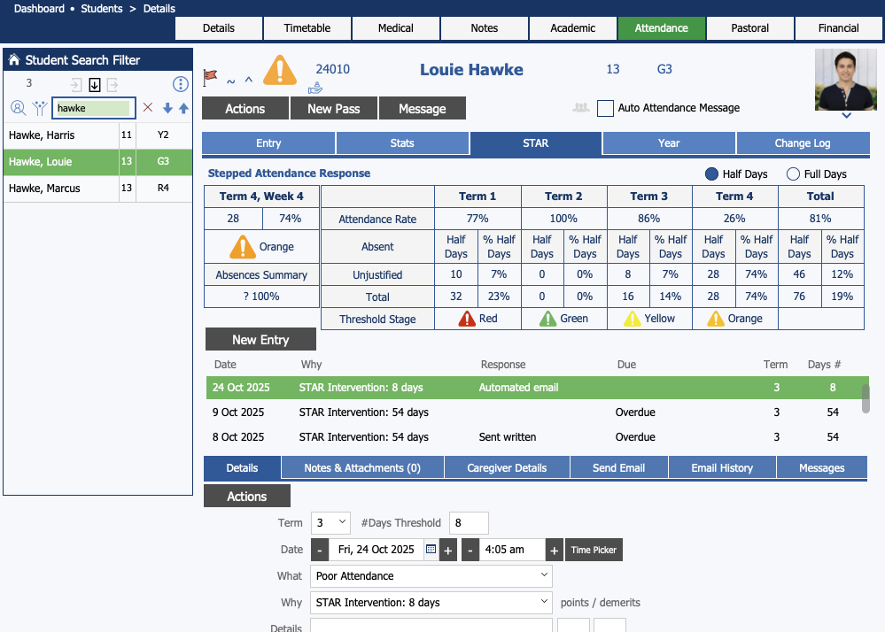 When students cross one of these thresholds, KAMAR will automatically create a STAR record for them. This is a Pastoral record in the Attendance category with a few extra bits on it (the term, the number of days absent this term, and a spot where