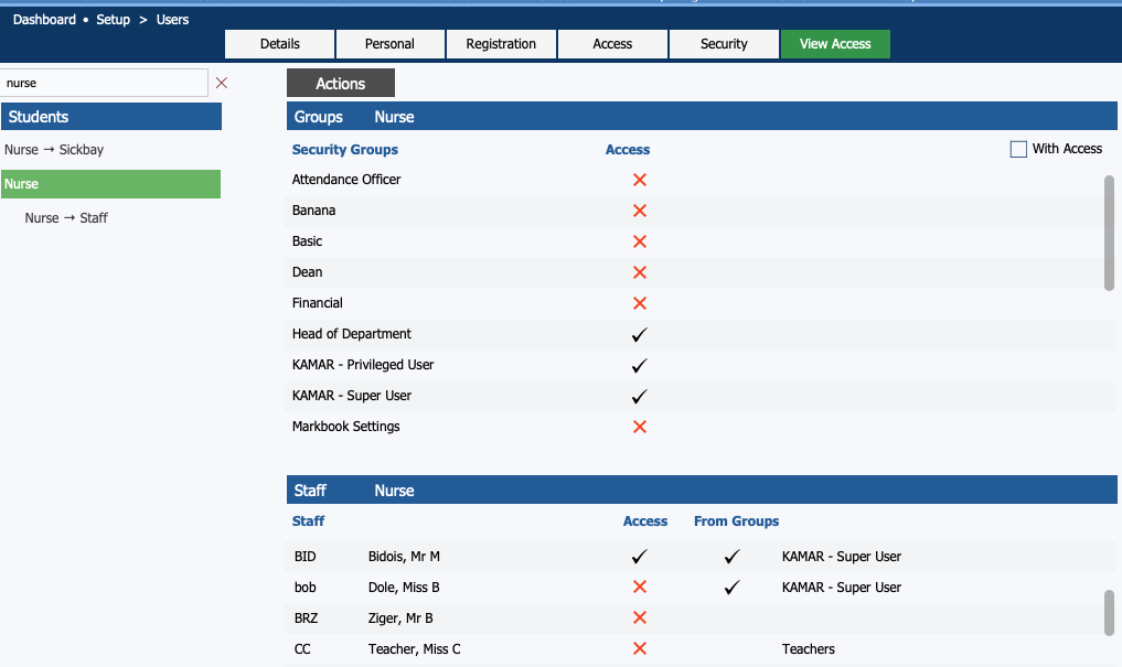 After some discussion on the KAMAR forums and some internal discussion it was noted that there is widespread access to the Nurse area in KAMAR which has the potential to breach privacy laws and professional standards if mis-used. The access to the Staff tab in the Nurse area is already restricted to Super User access and it made sense to increase this purview to include the whole Nurse area.