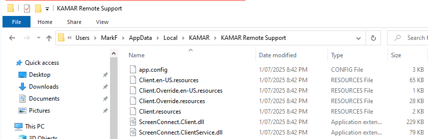 4: Click AppData to go back up one level. Double click Local, then double click KAMAR, then double click KAMAR Remote Support. You should see the following: